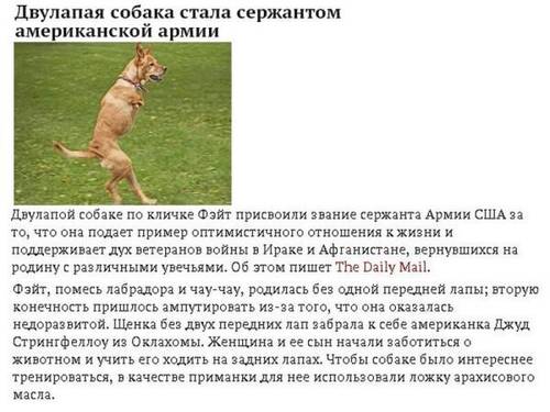 «Двулапой собаке по кличке Фэйт присвоили звание сержанта Армии США за то, что она подает пример оптимистичного отношения к жизни и поддерживает дух ветеранов войны в Ираке и Афганистане, вернувшихся на родину с различными увечьями. Об этом пишет The Daily Mail.