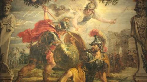 Пика выпала из рук, Гектора придавили щит, шлем и броня. Ахейцы бросились его добить, но Гектора окружили храбрейшие воины и подняли над ним щиты.
