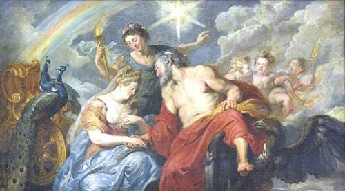 (Кажется, впервые упоминается о том, что Гера — черноволосая, брюнетка. Рубенс изобразил ее блондинкой.)