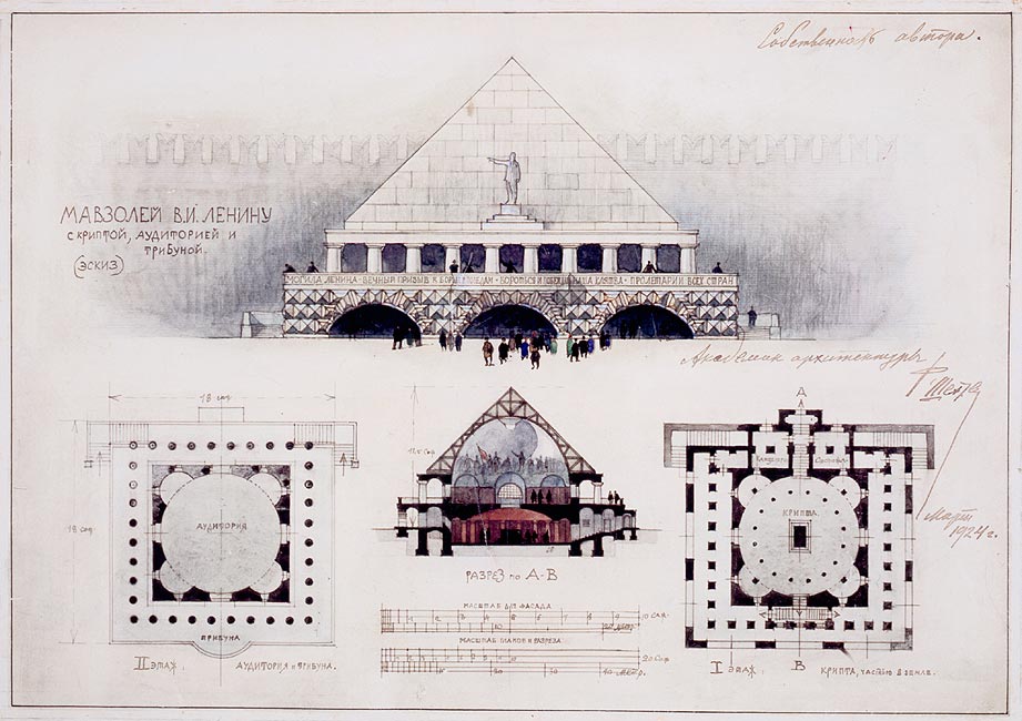 Да, Щусев сделал проект за одну ночь 25 января. И этот проект отличался от того, что мы видим на фото готового Мавзолея. На рисунках Алексея Викторовича действительно присутствуют четыре колонны, связанные антаблементом. А позже ротонда поверх основного объема усыпальницы.