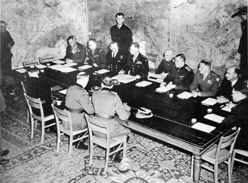 После этого в зал вошли представители германского командования, предъявившие документ о полномочиях, подписанный Дёницем.