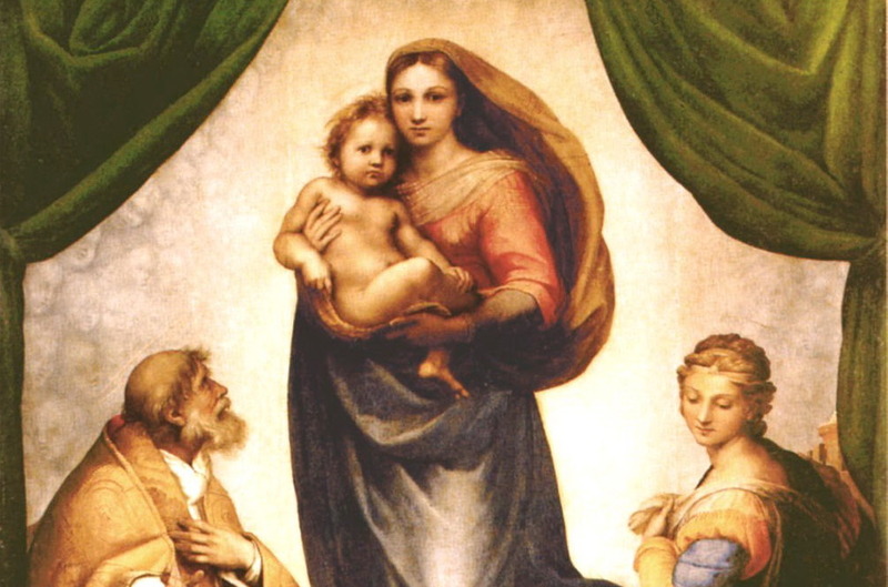 Кажется, что даже изображенные рядом с Мадонной папа Сикст II, в ногах которого находится папская тиара, символ духовной власти, и святая Варвара, одетая куда наряднее и роскошнее Богоматери, несколько удивлены ее человеческой беззащитностью, открытостью и совершенно земным видом крестьянской девушки. Нет на Сикстинской мадонне ни царского венца, ни роскошных одежд, не восседает она величественно на троне; даже по-детски распахнутые глаза Мадонны словно противопоставляются мудрому взгляду Младенца Христа.