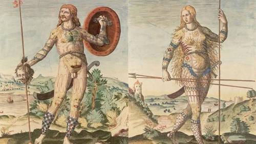 Всё это позволило в 1588 художнику Теодору де Бри нарисовать пикта — полностью обнажённого, с телом, густо разрисованным высокохудожественными изображениями, подстриженного и причёсанного по последней парижской моде. Чтобы не скучно было, ещё и пиктскую женщину изобразил — тоже голую, раскрашенную цветочками и звёздочками, да вдобавок ещё вооружённую.