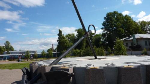 За зданием музея располагаются оригинальные горизонтальные солнечные часы, самые большие в Петербурге; появились они в 2005 году. Автором часов является Виктор Кахи. По ним можно определить время одновременно в двадцати четырех часовых поясах. Стрелкой, указывающей время на циферблате часов, является тень от штока большого старинного якоря. К сожалению, увидели мы там и следы пребывания вандалов — отодраны несколько круглых циферблатов, показывающих время в разных концах Земли. Впору у каждого объекта ставить круглосуточную охрану!