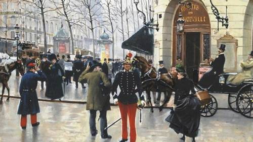 «Бульвар Сен-Дени». Начало зимы, первый снег. Публика одета тепло. Повар (справа), разгоряченный на работе, вышел охладиться — на нем только рубашка и фартук.