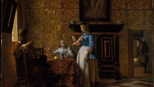 «Карточные игроки». Как пишут искусствоведы, эта сцена — забавы в в доме удовольствия. Богатство дома очевидно: роскошные полы, камин с колоннами, картины, отделанные под золото стены. И женщины — они очень молоды и красивы.