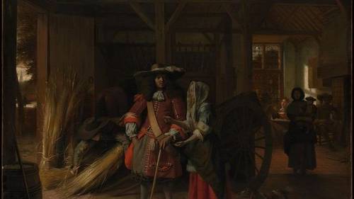 Молодая, приятной наружности и телосложения, аккуратно одетая женщина стоит рядом с франтоватым мужчиной. В руке у нее монета, которую она показывает постояльцу. Ее жест и лицо явно говорят о том, что монета не соответствует количеству и качеству оказанных в гостинице услуг: стойло и корм для лошади, пропитание для господина и его слуги, кровать и белье для этого столь почтенного дворянина. А постирать, погладить, почистить, подшить, подштопать одежду! Весьма вероятно, что были и другие какие-то мелочи, достойные немаленькой оплаты.