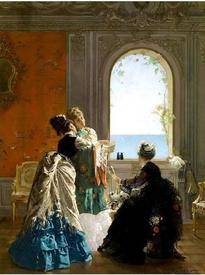 Три дамы в роскошном интерьере с видом на море: чайки, парусники на горизонте. Одна со счастливым лицом стоит с миской в руках, что-то в ней помешивает. Вторая, изящно изогнувшись, стоит спиной к зрителю, обнимая виновницу визита. Третья, в черном платье, сидит вполоборота, в ее левой руке веер.