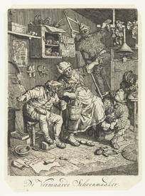В мастерской башмачника — примерка. Пожилая мадам решила то ли поменять обувь, то ли прикупить что-нибудь более закрытое в преддверии холодов и ненастья. Она сидит на стуле, перед ней на коленях — мастер, пытается надеть ей новый башмак. Видимо, башмак маловат, но мастер упорно хочет его натянуть на ногу клиентки. На всякий случай он послал за другой парой (надо подняться по лестнице) своего помощника.