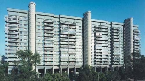 Что касается внешнего облика дома, то он имеет еще одну черту: он как будто расширяется кверху, поскольку каждый следующий из тринадцати этажей чуть-чуть выступает над предыдущим. Эффект этот визуальный, и получается он из-за того, что плиты лежат друг к другу под определенным углом.
