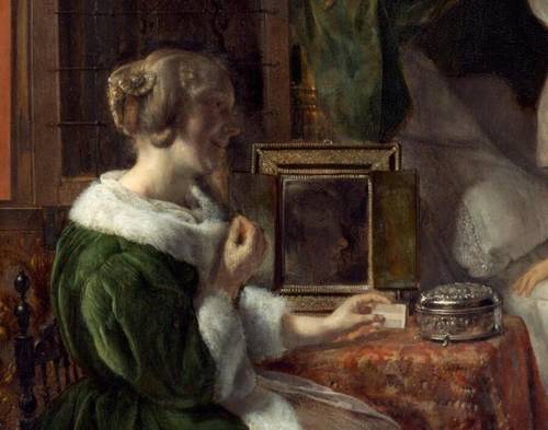 Что же происходит? Можно предположить, что это — визит к подруге. Вид девушки около кровати наводит на мысль, что она не совсем здорова. По этому поводу к ней пришла родственница, принесла лекарство. Они только-только собрались (вместе со служанкой) закончить утренний туалет, как появляется друг. Совсем некстати — хозяйка не в форме, она плохо себя чувствует (возможно, её качнуло при попытке встать, она оперлась о кровать) и совершенно не настроена принимать гостя (хотя по манере его поведения можно понять, что он здесь — свой человек: и пришел рано, и служанка его чуть ли не обнимает).