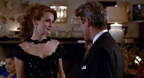 Например, «оперное» платье Джулии Робертс имело глубокое декольте «сердечком», которое полностью обнажало плечи и шею героини. Разумеется, для завершения образа шею следовало «одеть». Что и сделал герой Ричарда Гира, вручив спутнице фамильное бриллиантовое колье. К слову, колье было самое что ни на есть настоящее и стоило, ни много ни мало, 250 тысяч долларов. Поэтому рядом с актёрами незримо присутствовали два вооружённых охранника.