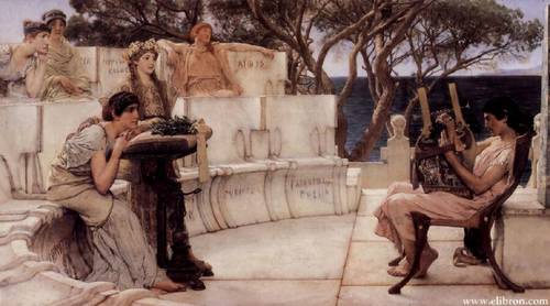 На картине Альма-Тадеме сэра Лоренса — мраморная трибуна с именными местами (видны написанные имена). На заднем плане — море. Два великих поэта античности: справа Алкей, слева Сафо. Алкей с лирой, он поёт и играет. Сафо слушает его, затаив дыхание. Перед ней — заготовленный для поэта лавровый венок. На ступеньках — подруги и воспитанницы Сафо. Они, видимо, не так очарованы поэтом и певцом.