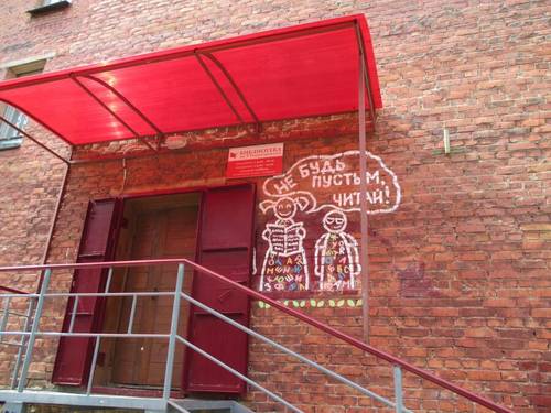 Смотрите на фото различные примеры современных библиотечных агиток — не только в форме плакатов, но и в форме надписей на кирпичной стене.