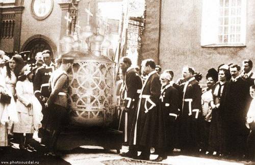 Представьте себе пасхальное шествие. Восемь человек несут на своих плечах специальные оглобли, на которых висит огромный фонарь. Более двух метров высотой, богато украшенный, с позолотой, со слюдяными оконцами, куда вставлялись свечи, которые не тухли от порывов ветра, с пятью куполами сверху. Вес этого чуда 160 кг.