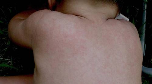 Примерно на третий день болезни на теле появляется высыпание, которое представляет собой небольшие красные пятнышки. Они выглядят как при краснухе, но лечить их не надо. Пятна не зудят, не чешутся и ребенка никак не беспокоят.