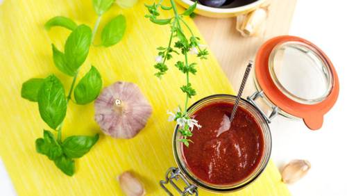 Способ приготовления. Помидоры пропустить через мясорубку, предварительно очистив от кожицы. Тушить на медленном огне, пока их масса не уменьшится в два раза. После этого добавить по вкусу уксус, соль, сахар, чеснок, черный перец, базилик, гвоздику и лавровый лист. Тушить еще минут 10, после чего остудить и хранить в холодильнике.