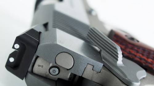 1. В чертах этого маленького, сверхкомпактного пистолета безошибочно угадывается Кольт 1911. Хотя патрон остался прежний, но все детали, кроме общей толщины ствола, пропорционально уменьшены. При этом пистолет остался удобным и безопасным. И красивым. Качество покрытия выше всяких похвал. Рукоятка хорошо лежит даже в большой ладони, опираясь специальной выемкой на мизинец стрелка. Кнопка выброса магазина на привычном для владельцев «полноразмерного» Кольт 1911 месте. А вот рычаг предохранителя несколько удлинён, поскольку толщина рукоятки несколько меньше, чем у «настоящего» Кольта, и чуть загнута вверх. Не совсем «аутентично», но очень удобно. Автоматический блокиратор ударника предотвращает случайный выстрел при ударе заряженного пистолета о твёрдую поверхность.