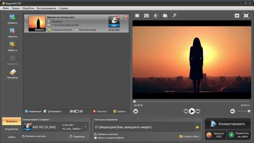 С ВидеоМАСТЕРОМ вам больше не придётся тратить время на поиски фильмов и сериалов в подходящем расширении. Теперь вы сами сможете менять форматы, как вам удобно. Улучшайте качество видео, накладывайте эффекты, публикуйте готовые ролики на сайтах и в соцсетях или просто наслаждайтесь просмотром в отличном качестве!