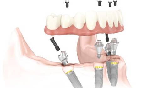 Суть методики «All-on-4» заключается в установке четырех имплантов в челюстную кость, на которые фиксируется сначала временный, а затем постоянный несъемный протез. В боковые отделы имплант устанавливается под углом: это позволяет хирургу-имплантологу еще на этапе подготовки выбрать угол наклона, обойдя при этом важные анатомические структуры и участки с атрофией кости.
