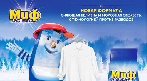 «Миф» был поддержан новой рекламной кампанией на телевидении: новый «Миф» — это целый новый мир! Запах морозной свежести переносит семью в зимний лес. В мире пушистого снега нет места пятнам — если присмотреться, все вокруг сделано из кристально-белого белья! Благодаря улучшенной формуле новый «Миф» справится со следами, а сон на белоснежных простынях будет так же прекрасен, как на свежем воздухе.