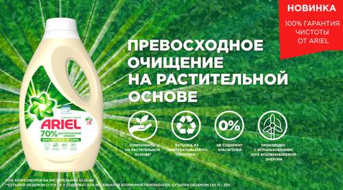 — Основываясь на потребностях покупателей, мы знаем, что многие люди сегодня не удовлетворены эффективностью моющих средств на растительной основе. Разработка продуктов, обеспечивающих надежную чистоту, — это то, что мы умеем делать лучше всего. Стирка при низких температурах — это самое важное, что люди могут сделать для изменения экологической ситуации в мире сегодня, поэтому вместе с брендом Ariel мы хотим сделать следующий шаг на пути к достижению целей по устойчивому развитию, включая использование возобновляемых или переработанных материалов для продукции и упаковки, — комментирует Роксана Станческу, вице-президент по развитию категорий средств для стирки и ухода за домом P&G в Восточной Европе.