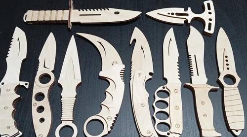 - Имитация ножей кс го из дерева — вариант для коллекционеров. Дерево можно раскрасить, нанести на рукоять любую символику, а лезвия выкрасить в цвет подходящего типа стали.