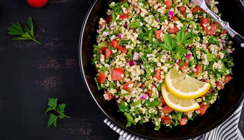 Пока варится булгур, в глубокой тарелке или салатнице приготовляют дополнительную смесь: оливковое масло, лимонный сок и соль. Заливают смесью булгур из кастрюли и хорошо перемешивают. Дают постоять еще 15 минут.