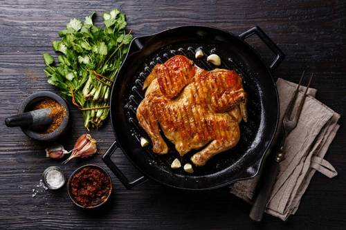 Она нам будет нужна и для маринада, и для самого процесса жарки. Продаются готовые чугунные сковороды для жарки цыпленка табака с прикручивающейся крышкой — она придавливает тушку в сковороде.