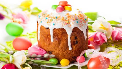 Можно ограничиться белковой массой, а можно посыпать кулич какими-нибудь украшениями — они сейчас имеются в продаже в огромном ассортименте (а вот нашим мамам и бабушкам приходилось для этих целей красить сахар и пшено). У меня однажды не было никаких украшений, так я использовала гранулы растворимого какао — тоже симпатично получается.