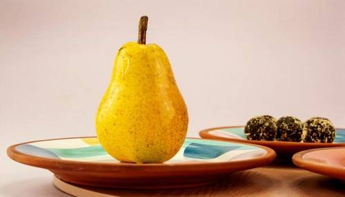 - Порезать 4−5 груш на мелкие ломтики, положить в стеклянную форму (тарелку), сбрызнуть чайной ложкой лимонного сока и посыпать ¼ стакана изюма.