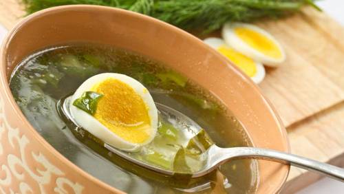На всякий случай: готовим бульон, режем картошку, закидываем в бульон, соль по вкусу, чёрный перец горошком. Отдельно отвариваем яйца. За две-три минуты до готовности добавляем щавель и порубленные на четвертинки яйца.