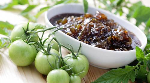 Зеленые помидоры разрезать пополам, удалить семена и варить в трех водах по 5−7 минут, чтобы помидоры не горчили. Тщательно промывать каждый раз холодной водой. Затем положить помидоры в сироп, очистив их от кожицы, и варить до загустения. Оставить на ночь охлаждаться и разлить по банкам.