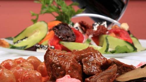 2 вариант (ксантийский и карпенисийский). Разогрев в кастрюле примерно 100 г оливкового масла, обжариваем на нем 700 — 800 г мяса (говядину или крольчатину), порезанного порционными кусками. К подрумянившемуся мясу добавляем мелко покрошенный чеснок (1 — 2 зубчика) и наливаем 100 г красного вина, а когда оно выпарится — тертые помидоры (2 шт.), соль, перец (черный и душистый), корицу, лавровый лист (можно еще и немножко воды).
