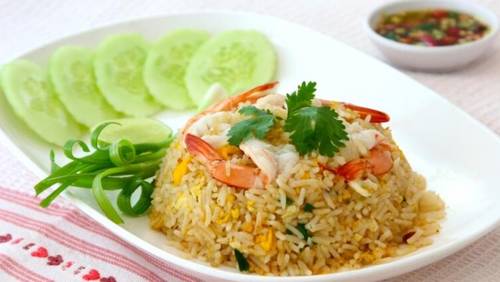Берете один стакан любого белого риса, моете, заливаете водой и ставите на плиту вариться. Пока рис варится, нарежем мелкими кубиками 200 г молочной колбасы, один средний свежий огурец, одну небольшую головку белого лука и одну среднюю морковку. Обжариваете все слегка на сковороде, к этому времени рис должен свариться. Забиваете в кастрюлю с рисом два свежих яйца и перемешиваете, затем добавляете обжаренную смесь из колбасы и овощей, а также пару столовых ложек консервированной кукурузы. Все тщательно перемешиваете.