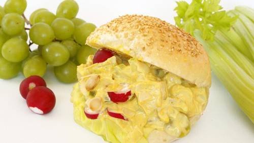 Бутерброд Coronation Chicken можно сделать более полным, положив на начинку листик китайского салата, четыре кружочка огурца и два кружочка помидора.
