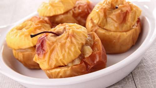 Яблоки очистить узким ножом от сердцевины, не разрезая их. Проварить в негустом сахарном сиропе пару минут. Вынуть и уложить в смазанную маслом форму. На место сердцевины вложить изюм, орехи, другие сухофрукты по вкусу.