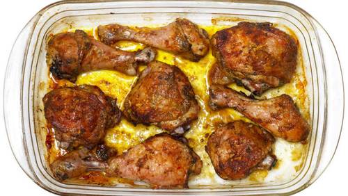 Маринад был в сухом виде (приправа в комплекте с рукавом для выпекания). Натер порционные куски курицы маринадом, сложил в стеклянную банку, добавил подсолнечного масла и поставил в духовку. Прозрачное стекло позволяло контролировать степень готовности и внешний вид (красивая румяная корочка). Масло на дне кипело и ничего не пригорало. Даже грудка получилась на редкость сочной — не сухой.