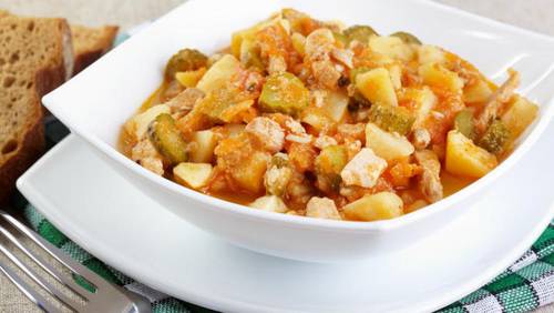Какие продукты нам понадобятся для приготовления азу по-татарски в расчете на 4 взрослых порции: мясо — 1 кг мякоти баранины (можно заменить говядиной); огурцы соленые — 3 шт., помидоры свежие- 2 шт; лук репчатый — 3 шт.; масло топленое — 200 граммов; картофель — 5 или 6 штук; бульон или вода — не менее двух стаканов; чеснок, зелень, перец и соль на вкус.