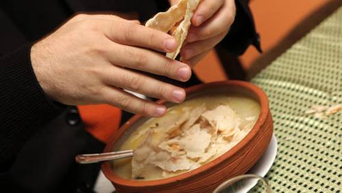 Стол накрыт, все сели. Каждый в свою тарелку должен накрошить сухого лаваша. Теперь можно потихоньку в тарелку положить хаш. Кто-то любит бульон отдельно, мясо после. А кто-то все вместе. Теперь можно хаш посолить, положить в него чеснок и перемешать.