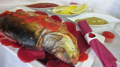 Выкладываем сверху рыбу, обкладываем ее оставшимися морковью и свеклой, заливаем холодной водой, аккуратно, сбоку, приблизительно до середины рыбы. Воду солим, добавляем сахар, перец горошком и немного уксуса, чтобы свекла не теряла своего цвета, и ставим в разогретую до 200 градусов духовку приблизительно на час-полтора. Во время запекания рыбу можно и даже нужно поливать бульончиком.