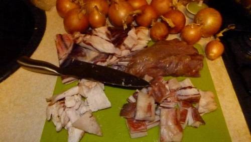 На 1 килограмм баранины необходимо взять 1 кг очищенного лука, все это требуется порезать: мясо — небольшими кусочками, а лук — тоненькими полукольцами.