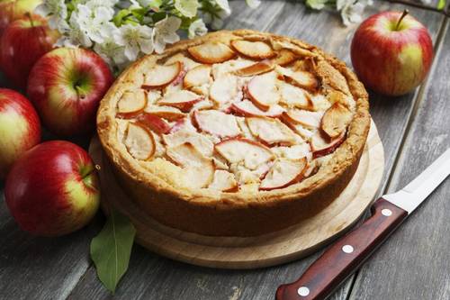 Надо: 4 яйца, 1 стакан сахара, 1 пакетик ванильного сахара, разрыхлитель, 3−4 яблока (лучше кислых, а еще лучше «антоновку»), 180 граммов муки и грецкие орехи (от себя: просто с ними вкуснее).