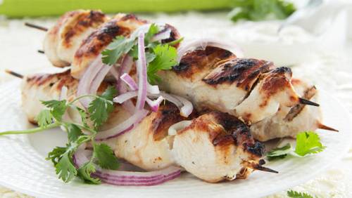 Через 4 часа достаем маринованные кусочки, очищаем от лука, надеваем на шампур или укладываем на решетку и жарим на углях 15−20 мин.
