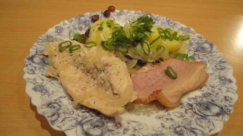 Пока возились с луком и корейкой, сковорода успела немного подостыть. Засыпаем в неё немного лука так, чтобы он едва прикрывал дно. Боковую стенку сковороды обкладываем ломтиками корейки, а на оставшееся свободным место помещаем обжаренные порционные кусочки куриного филе. Сверху его накрываем приличным слоем шинкованного лука и… Всё это пищевое богатство заливаем сладким пивом вместе с изюмом, на котором он настаивался. После чего отправляем сковороду в духовку.