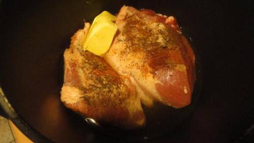Итак, томленое мясо. Берем кусочек свининки. Граммов на 700. У меня под рукой оказался на кило с плюсом. Тоже неплохо. По мышцам, чтобы не резать мясо, разделили кусочек на две неравные половинки, присолили каждую из них, старательно втерли сначала красный, а потом черный молотый перчик и — в казан их.