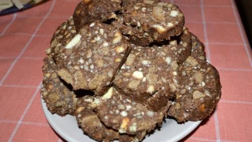 Я буду не я, если не добавлю что-то свое. Вот и в тот момент не удержалась и наломала в эту массу три квадратика шоколада. Много не стала класть, помня печальный опыт растапливания шоколада, когда готовила «Очень вкусное печенье». Подумала, что какао слишком мало, а я люблю насыщенный шоколадный вкус. Особой шоколадной насыщенности я не обнаружила потом, но и ничего не испортила, кусочки в массе растаяли. В следующий раз попробую добавить побольше шоколада. И скорее всего, натру его на терке. Как всегда, «умная мысля приходит опосля».