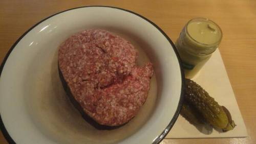 Так, ничего сложного. Для того чтобы с ними справиться, высшее кулинарное образование совсем не обязательно. Но желательно, чтобы дома был мясной фарш. Так, где-то около килограмма. Пара-тройка соленых огурчиков, горчица, немного растительного масла… Ну, и сковородка, само собою.