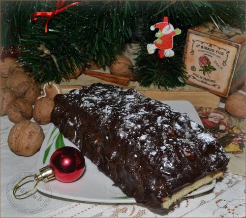 Я готовила рождественское полено немного по-своему, не рулетом, а слоями, и следующим образом: испекла бисквит, сделала апельсиновый джем и французский шоколадный крем «Ganache» (ганаш) для прослойки, собрала коржи в полено, залила кремом, распределив по поверхности грецкие орешки (о неожиданном появлении которых расскажу в одной из следующих публикаций), затем наложила финишный слой из шоколадной глазури, присыпав нетающей сахарной пудрой для имитации легкой заснеженности. Получилось весьма празднично и очень вкусно. Быть может, вам захочется приготовить этот рождественский десерт, рецепт которого даю ниже.
