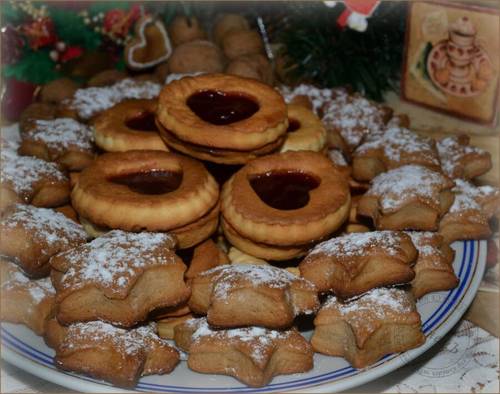 Двойное печенье с окошечками в виде сердечек и печенье в виде звёздочек, припорошенных «снегом», вполне смогут стать красивым украшением праздничного стола в грядущие новогодние праздники.